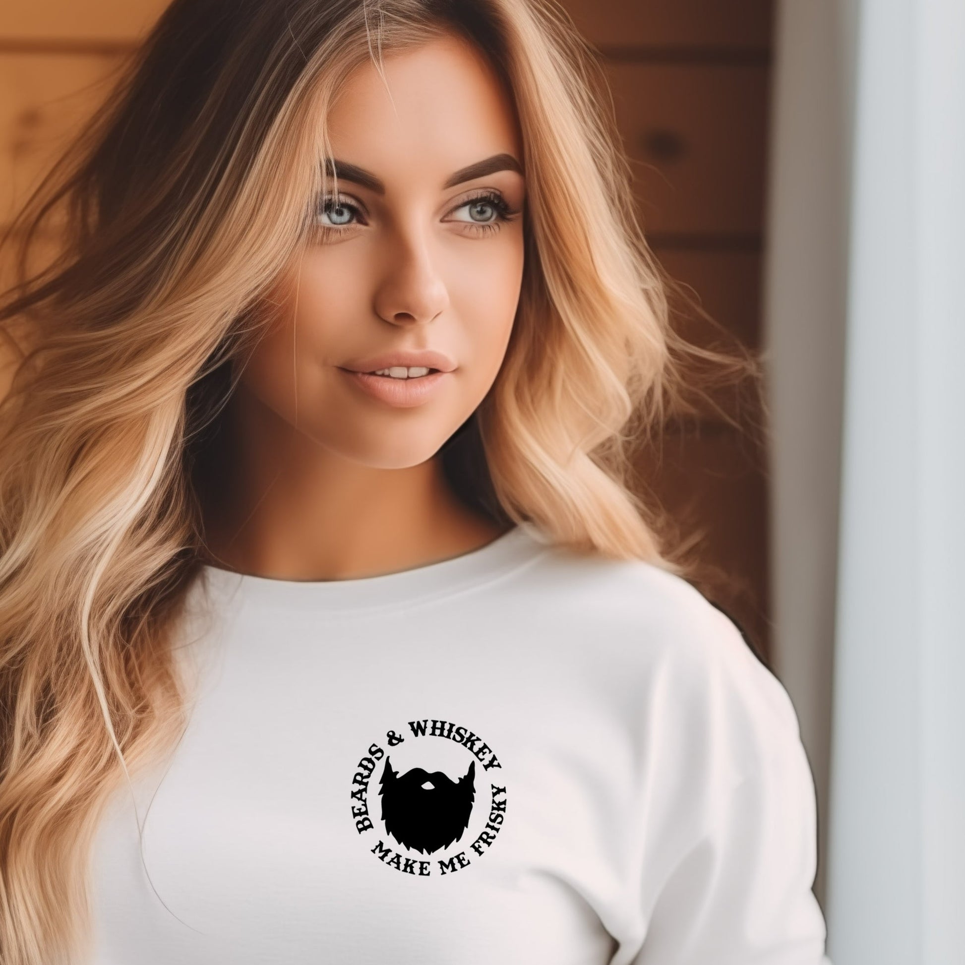 Beards and Whiskey Make Me Frisky (Pocket/Koozie)- Single Color (black)- 3" wide Plastisol Screen Print Transfer