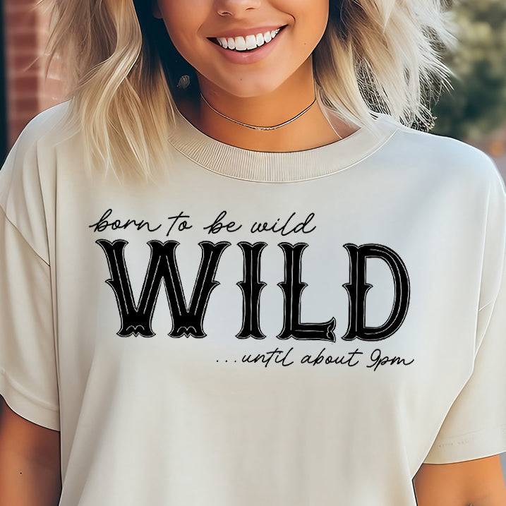 Born to Be Wild...Until About 9pm- Single Color (black)- 11.5" wide Screen Print Transfer