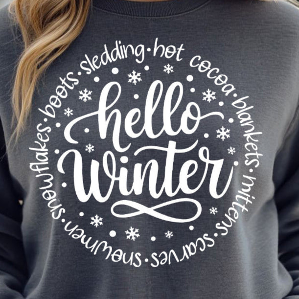 Hello Winter- Single Color (white)- 11.5" wide Plastisol Screen Print Transfer
