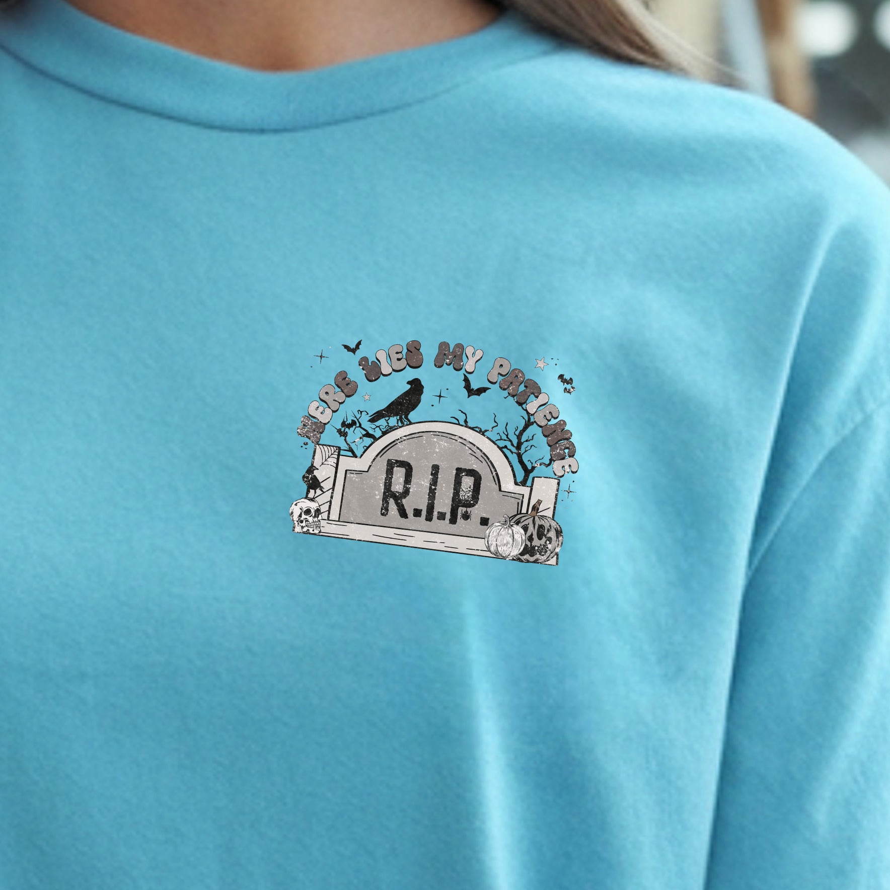 Here Lies My Patience (pocket/hat)- 3.2" wide DTF Transfer