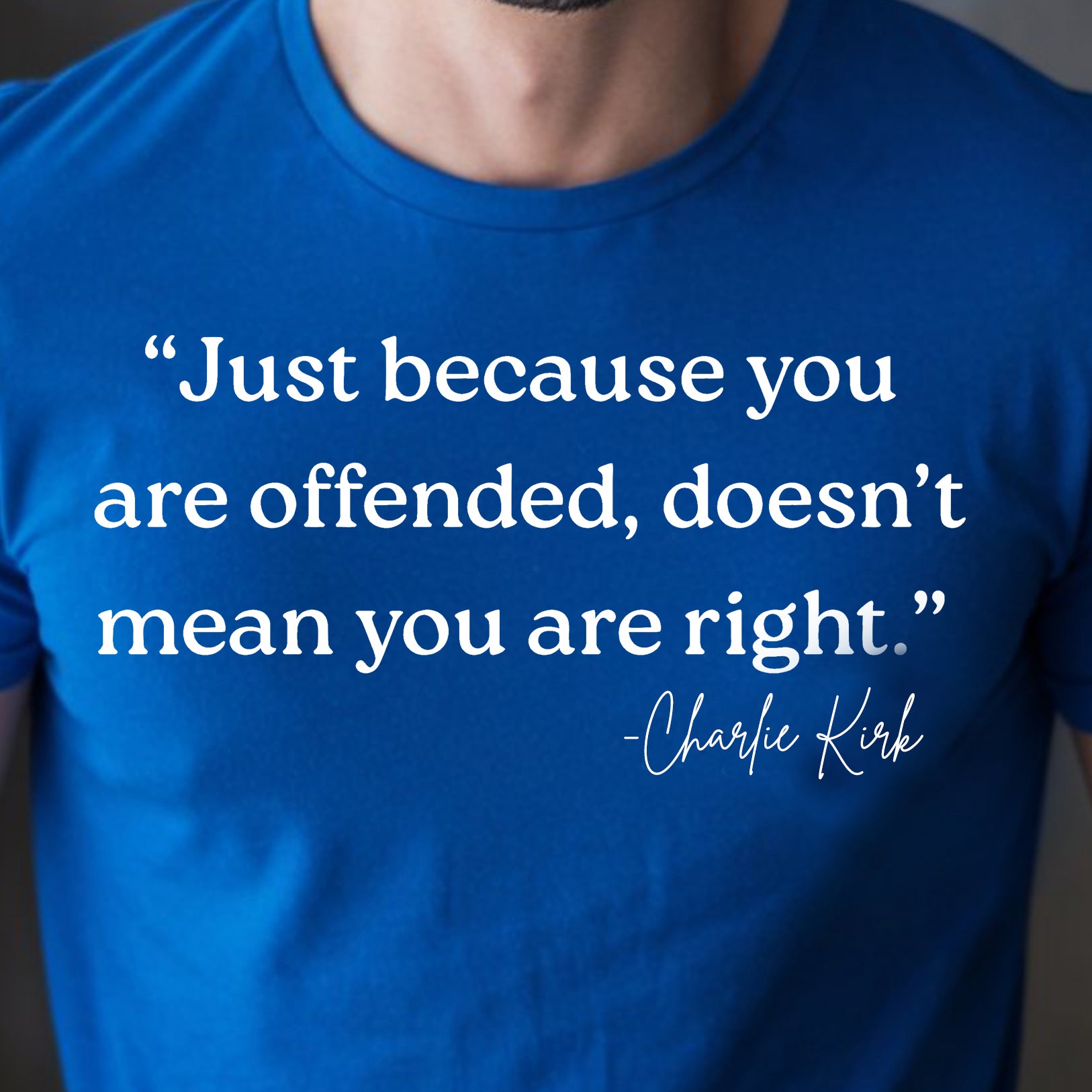 Just Because You Are Offended Doesn't Mean You Are Right- Charlie Kirk- Single Color (white)- 11.5” wide Single Color Transfer