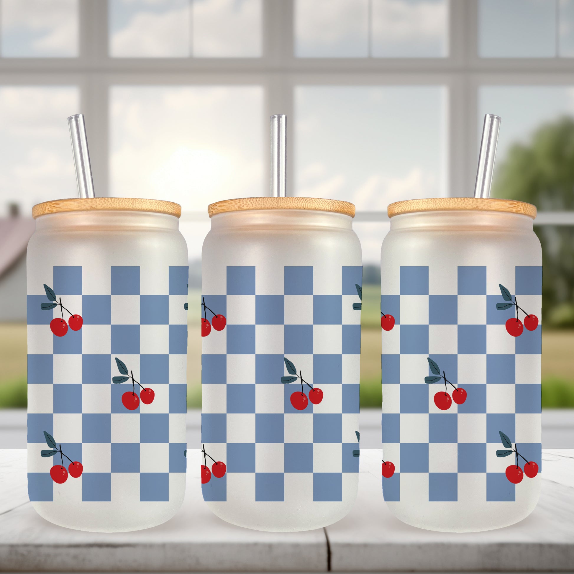 Blue Checkered Cherries UV DTF- 16oz Cup Wrap