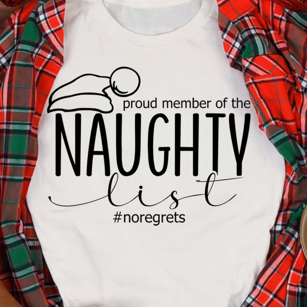 Proud Member of the Naughty List #noregrets- Single Color (black)- 11.5" wide Plastisol Screen Print Transfer