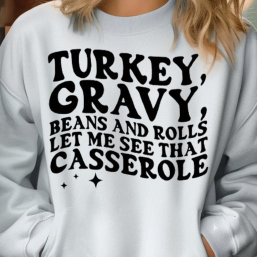 Turkey, Gravy, Beans and Rolls, Let Me See That Casserole- Single Color (black)- 11.5" wide Plastisol Screen Print Transfer