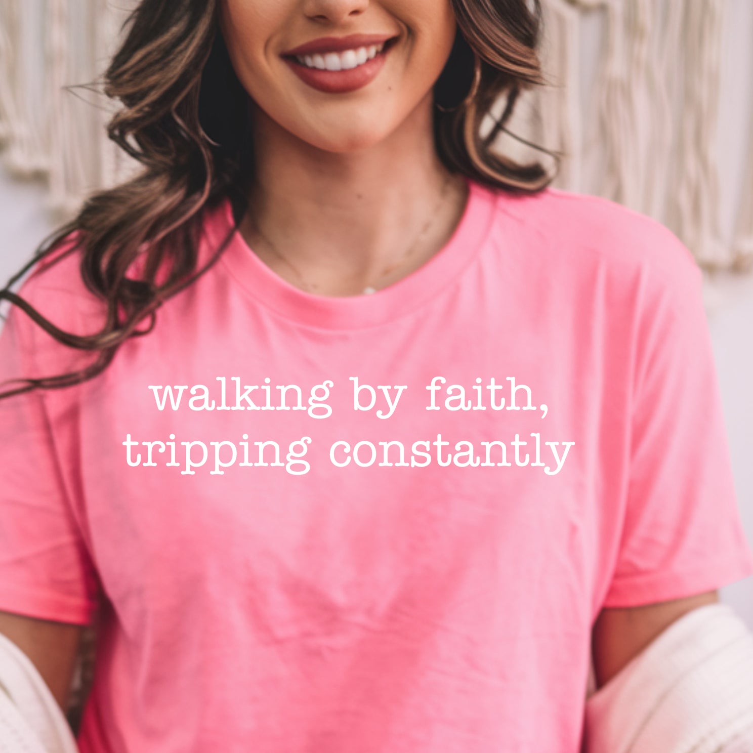 Walking By Faith, Tripping Constantly- Single Color (white)- 11.5” wide Single Color Transfer
